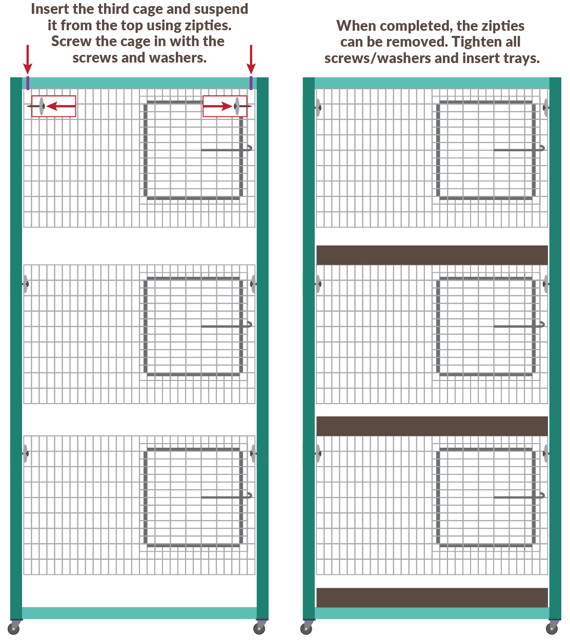 For the third cage, insert the cage into the frame and suspend it to the very top of the frame using zipties. Zipties allow us to get the cage attached to the very top of the frame so that it looks nice and clean.